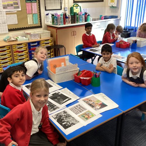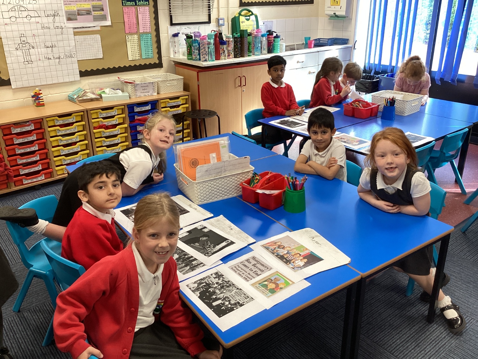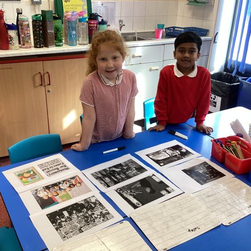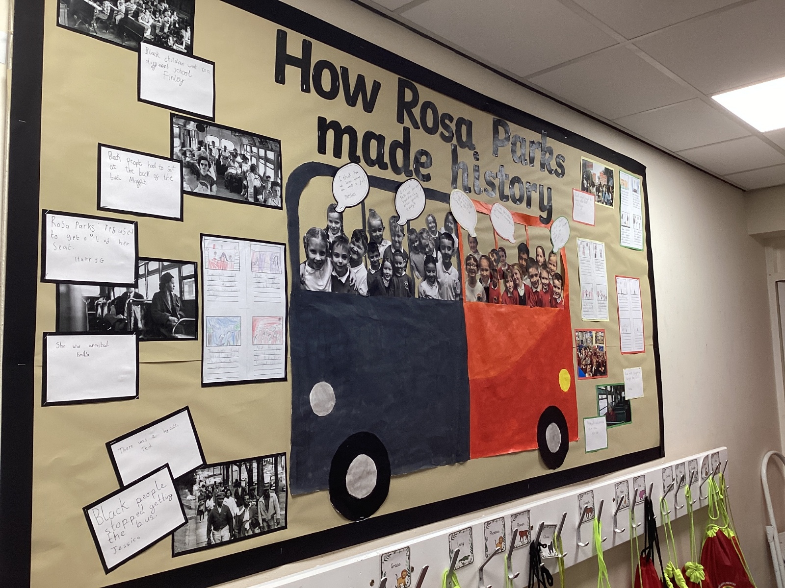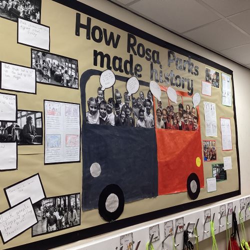 In History, we have been finding out more about Rosa Parks. We made a timeline of her life and chose some artifacts to make a museum all about why she was important. All this learning helped us to put together a display outside our classroom!