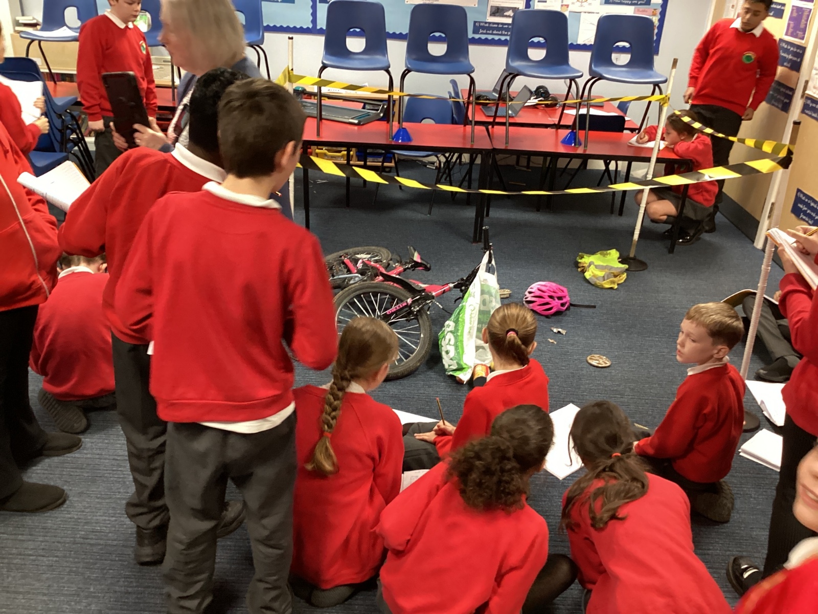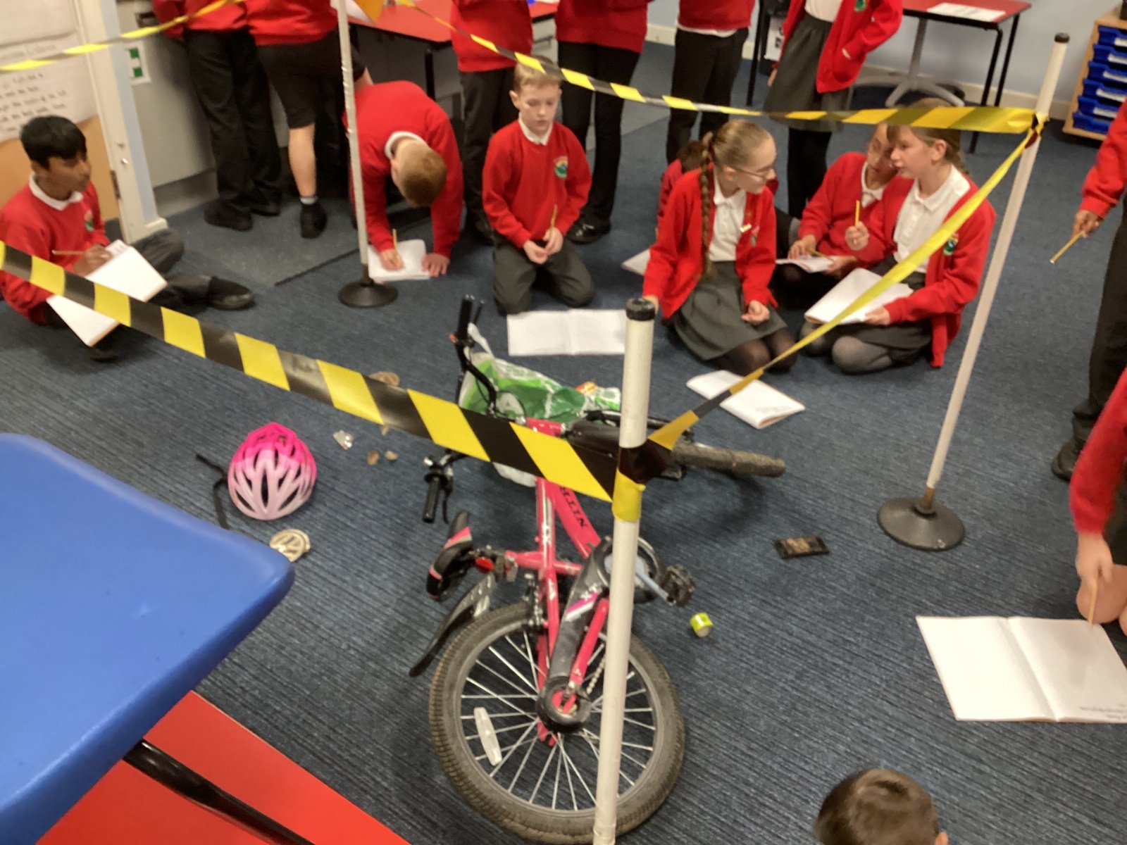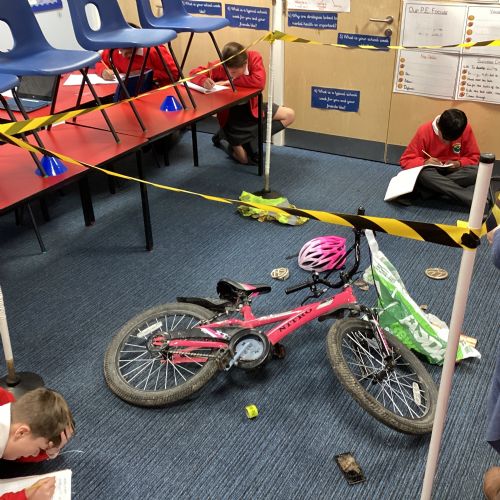 CRIME SCENE ALERT - This week we started our English unit of work on crime stories. So far we have had a crime scene in class and watched an episode of Scooby-Doo to look at suspects and alibis. Ruby also read to the class.