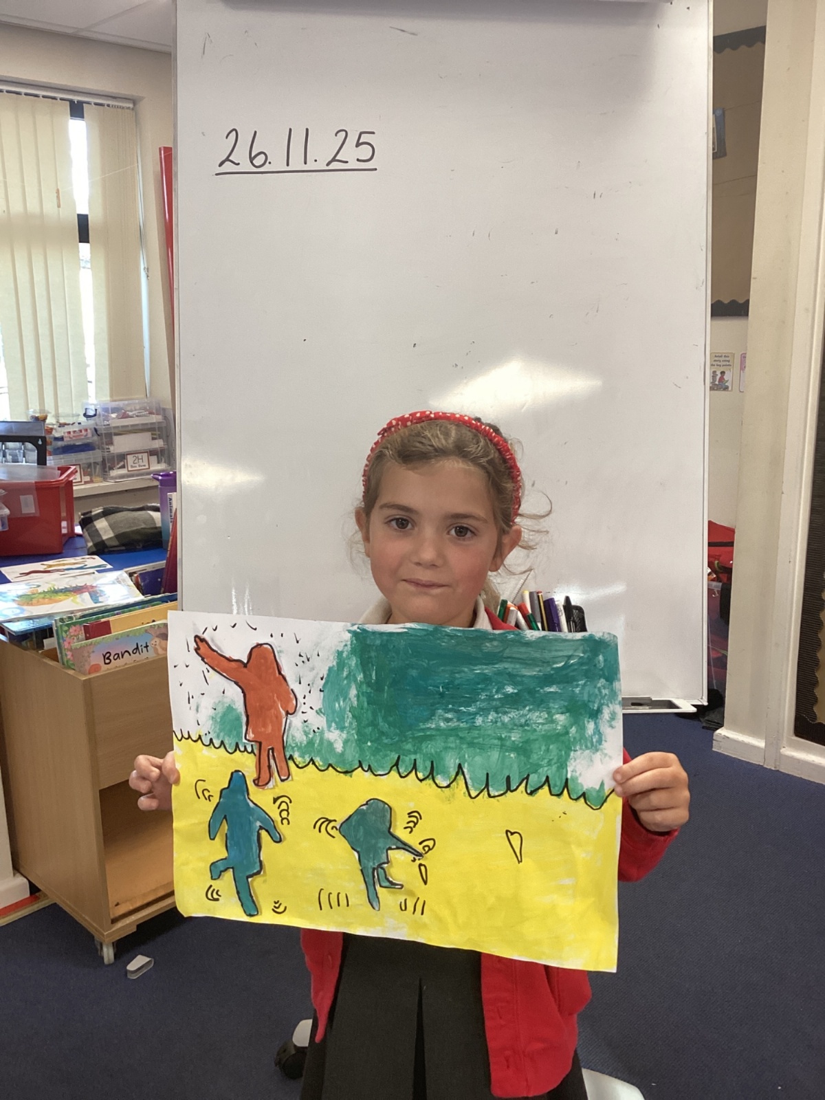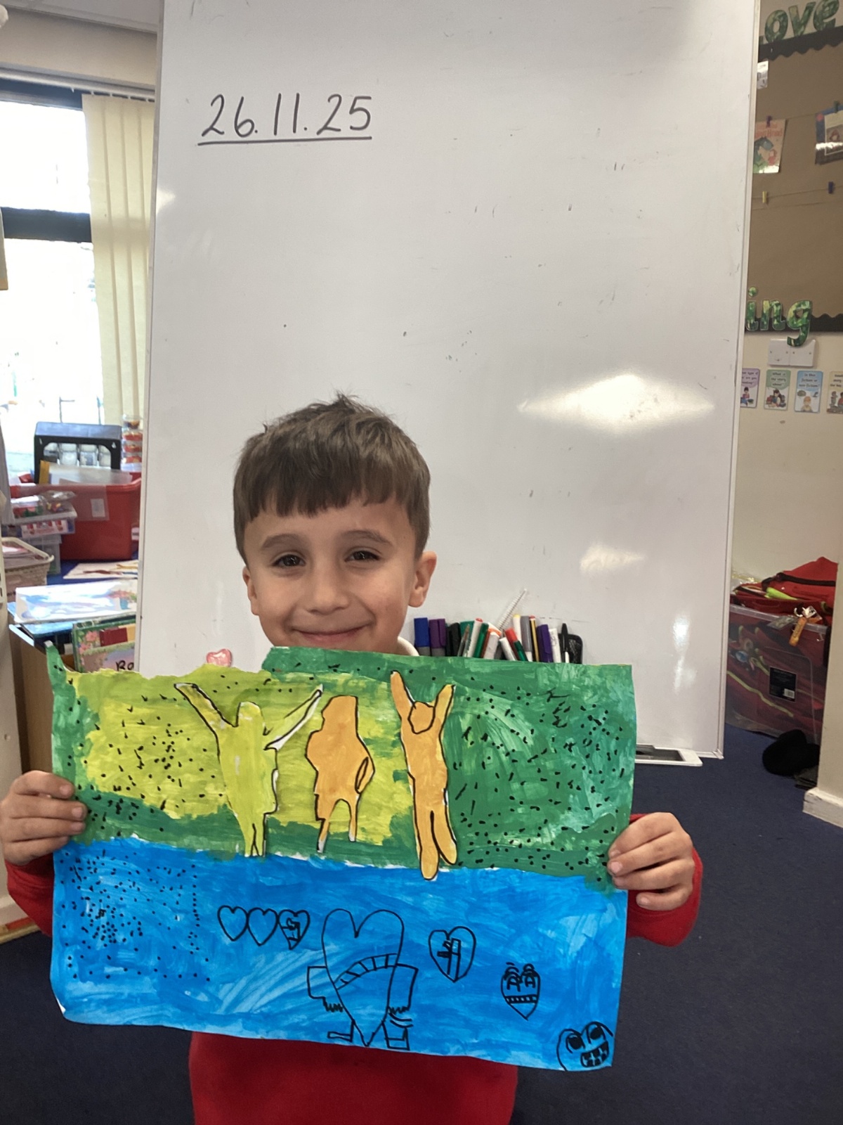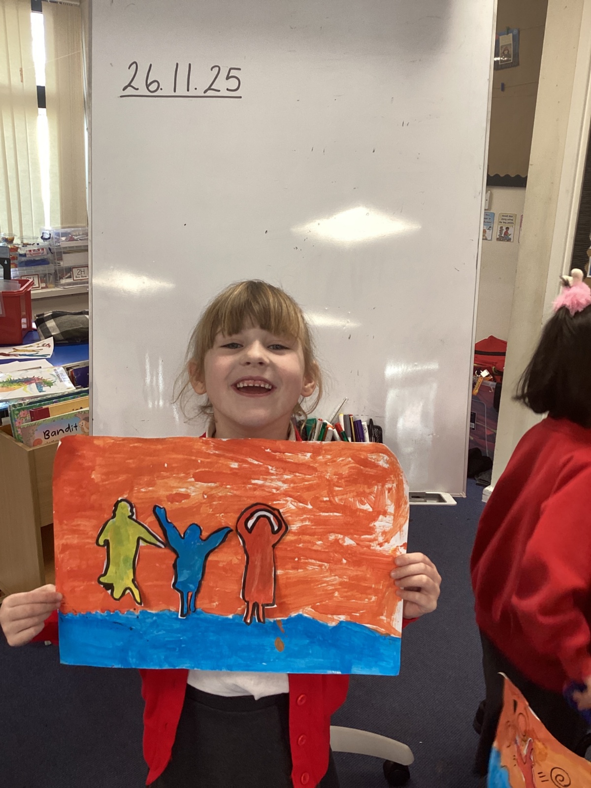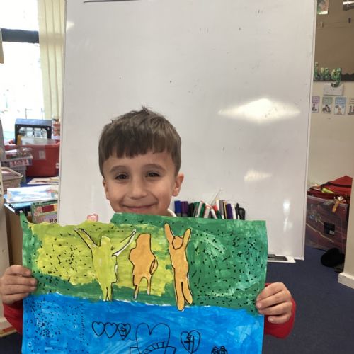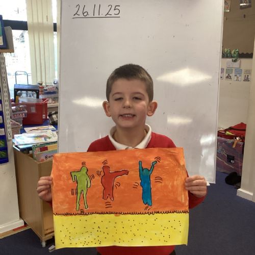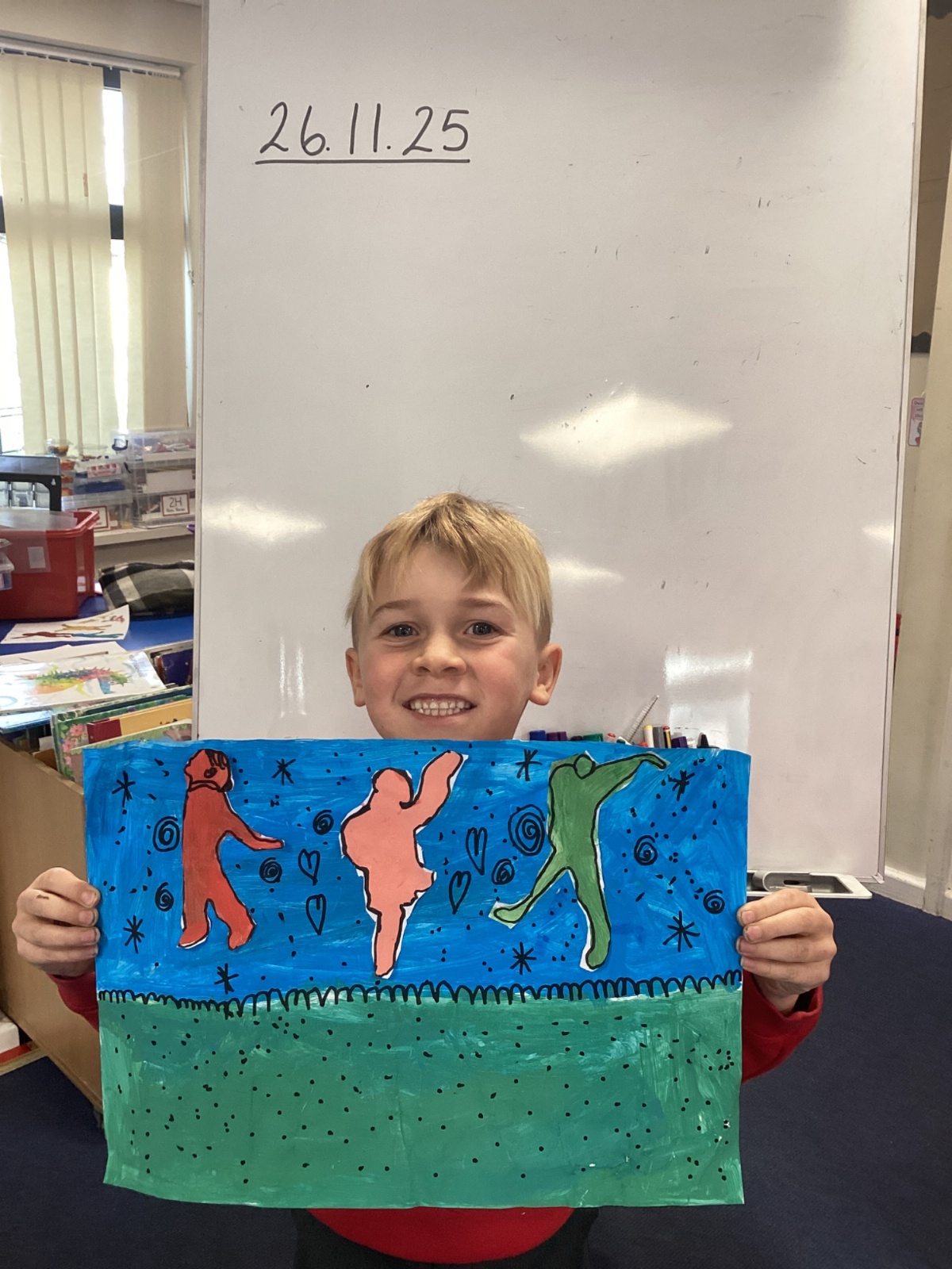 Our end-of-unit art pieces inspired by Keith Haring. Lots of colour mixing work and thinking about colour and emotions.