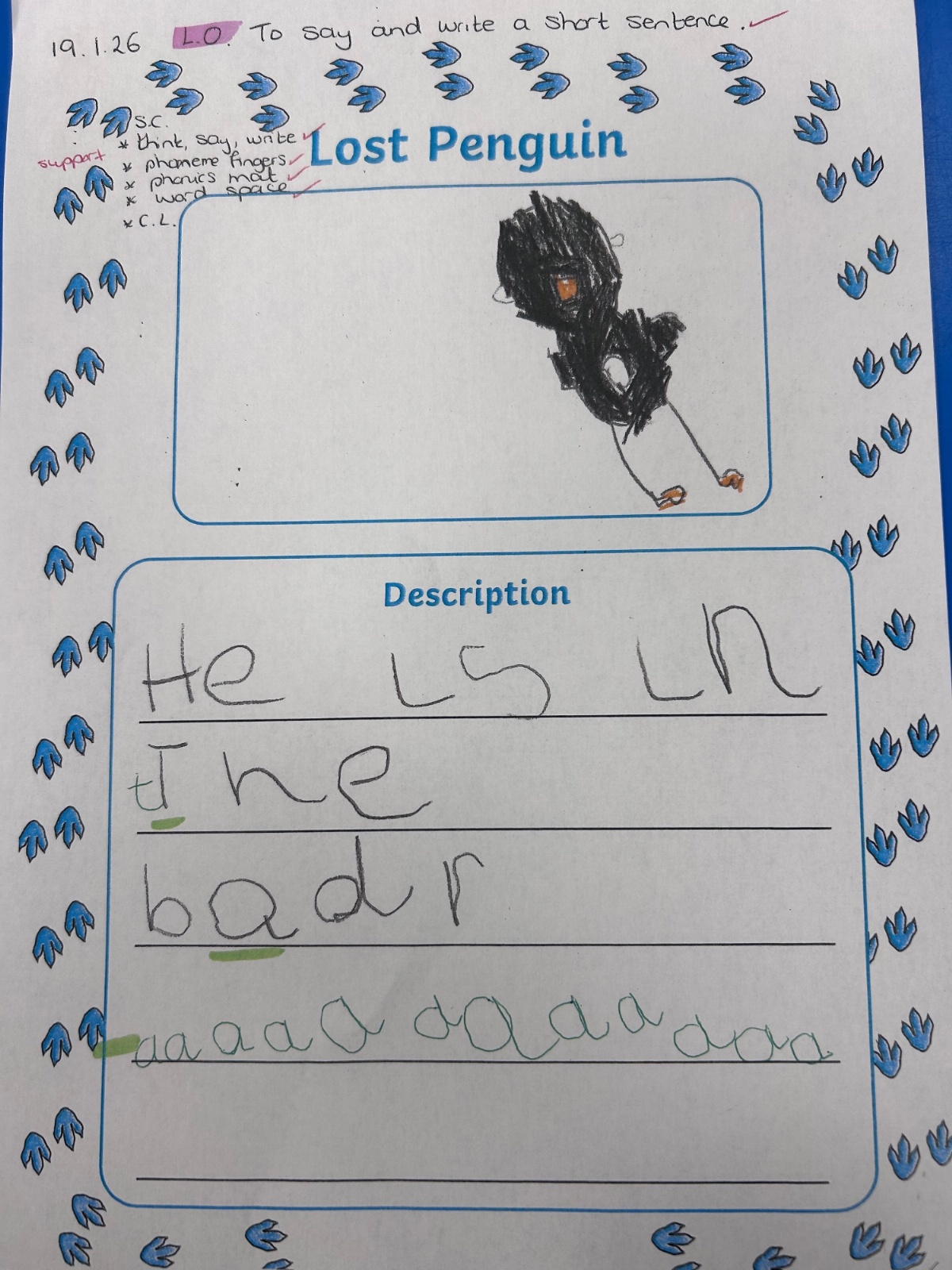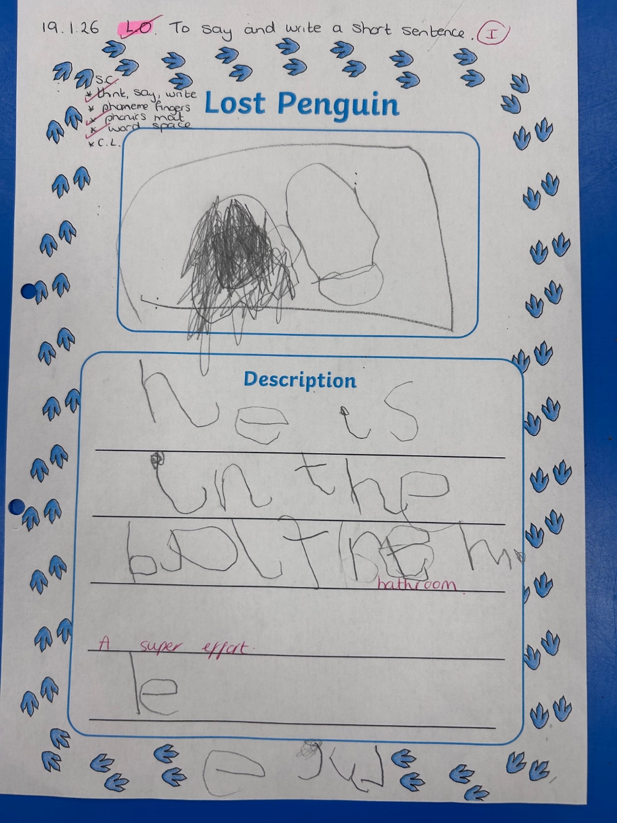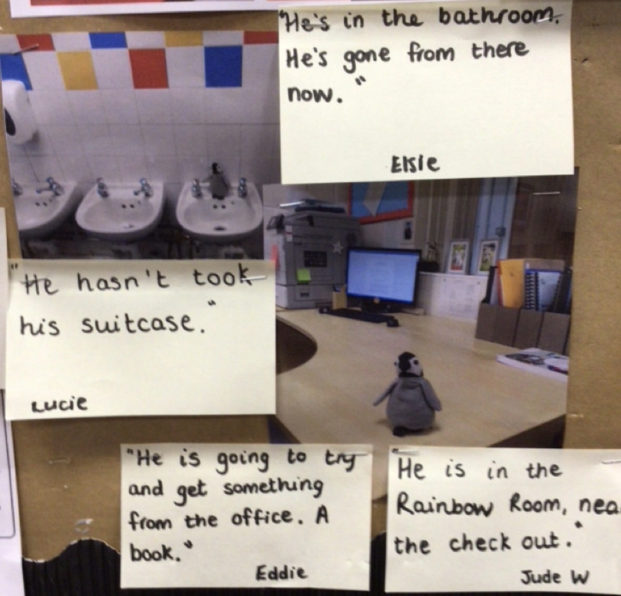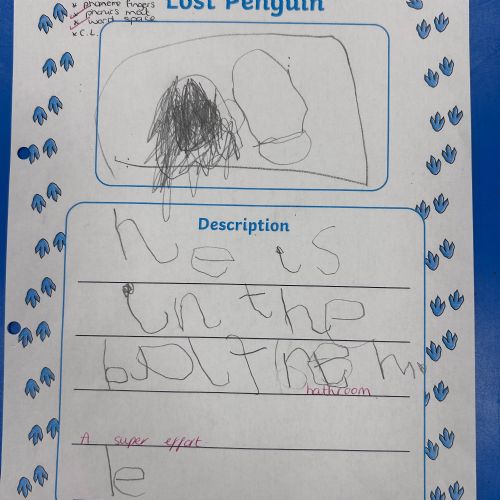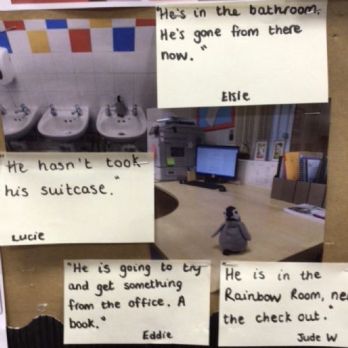 A little penguin came to visit our class. We asked him lots of questions like 'Where have you come from?' And 'How did you get here?' One day we got a message and some photos to tell us he had been exploring our school. We went on a penguin hunt and made posters to try and find him. Let us know if you spot him!