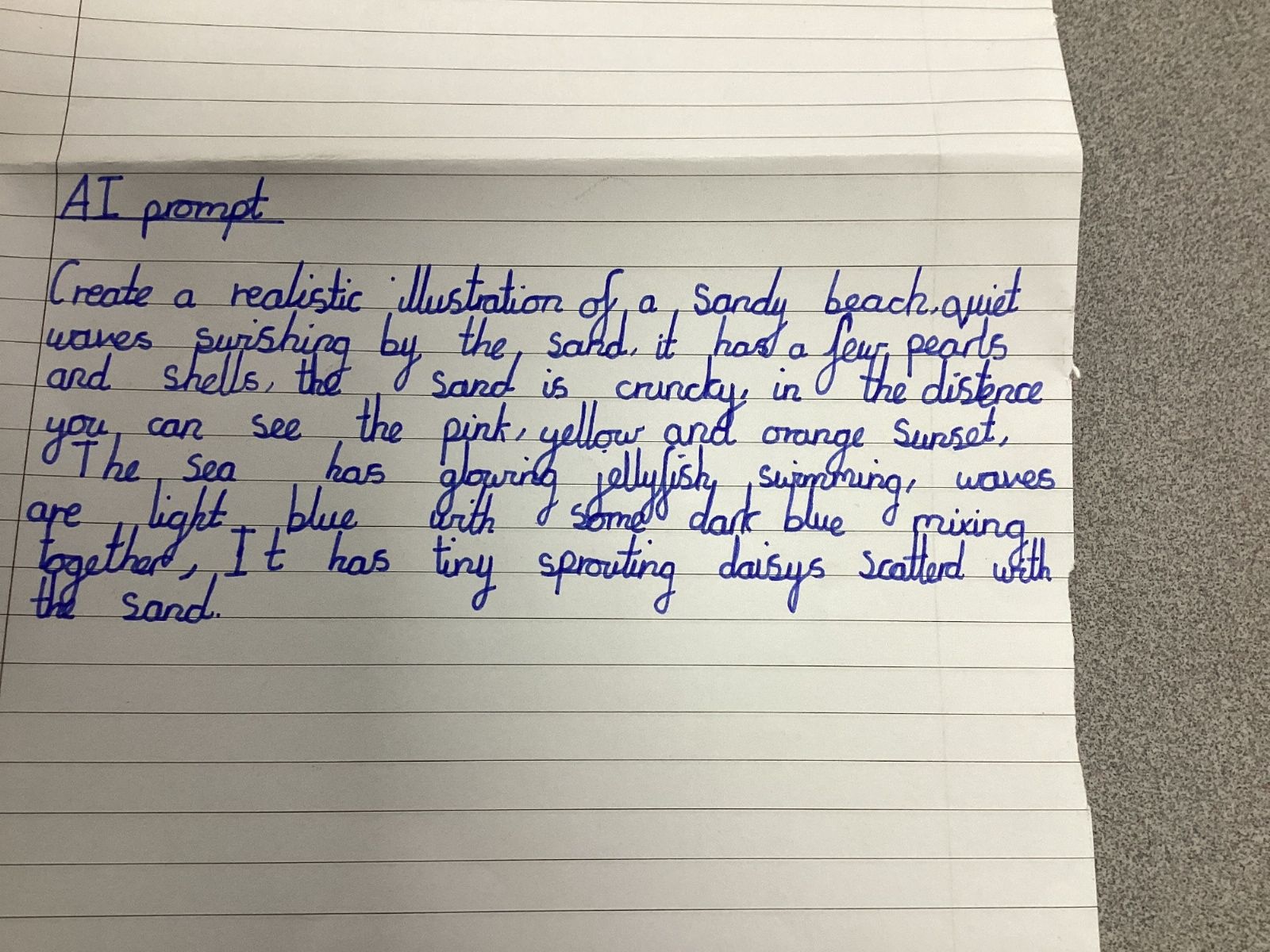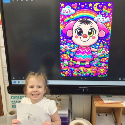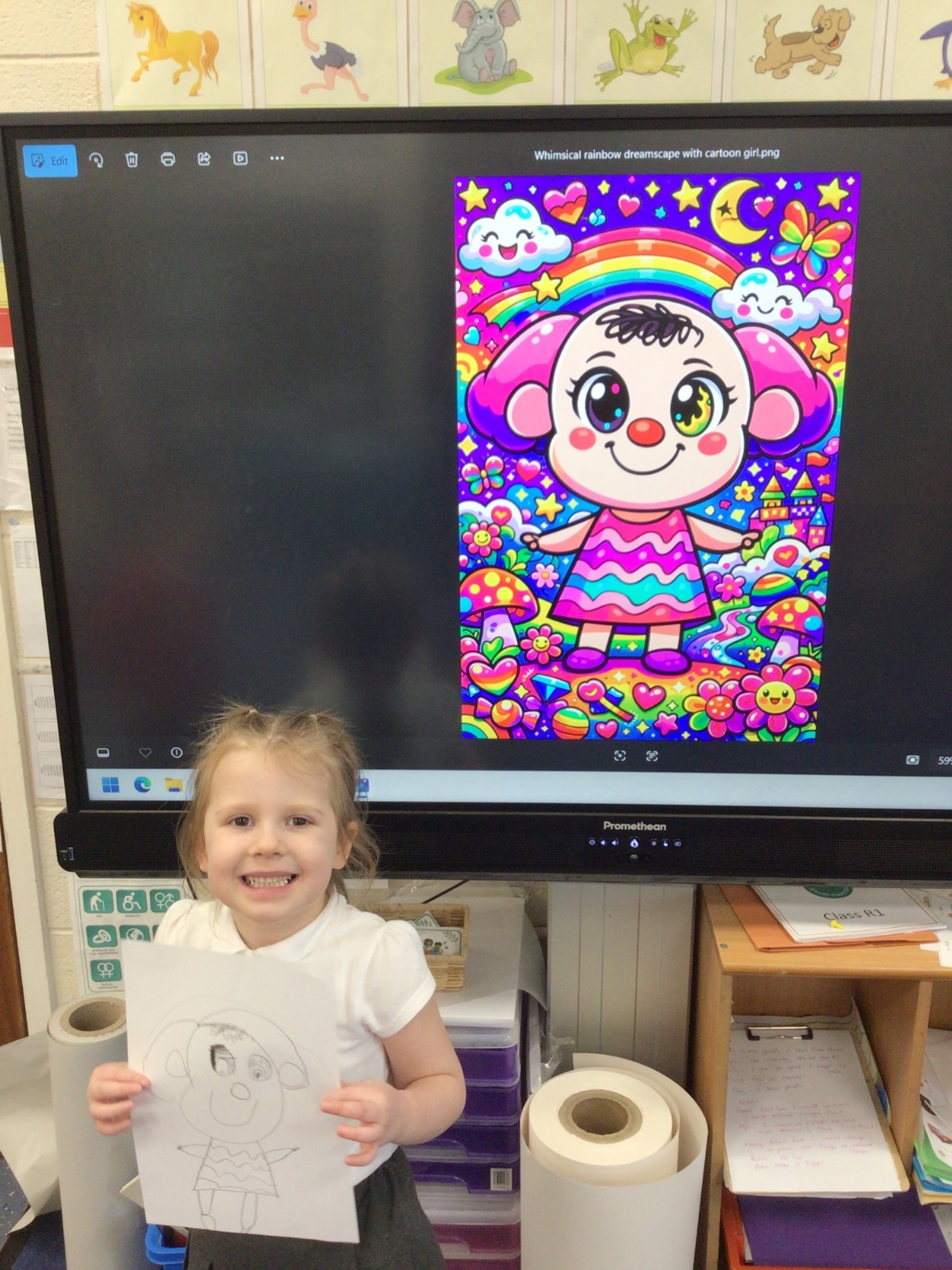 We are proud of the thoughtful discussions and creative work produced. Below are examples of the children’s work from the week,, demonstrating how AI can generate illustrations when given clear and detailed prompts. The children created their own drawings and/or wrote detailed descriptions as AI prompts. This helped them understand how clear instructions shape outcomes, while reinforcing the safe and responsible use of technology.