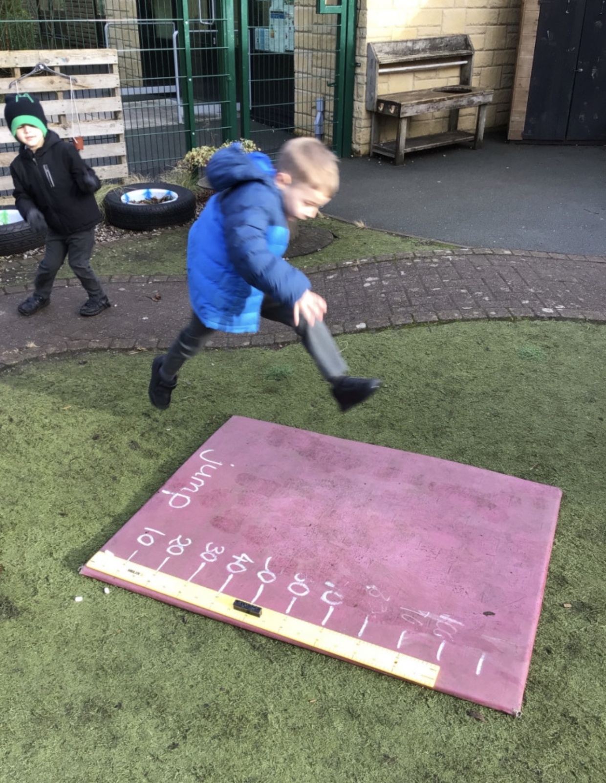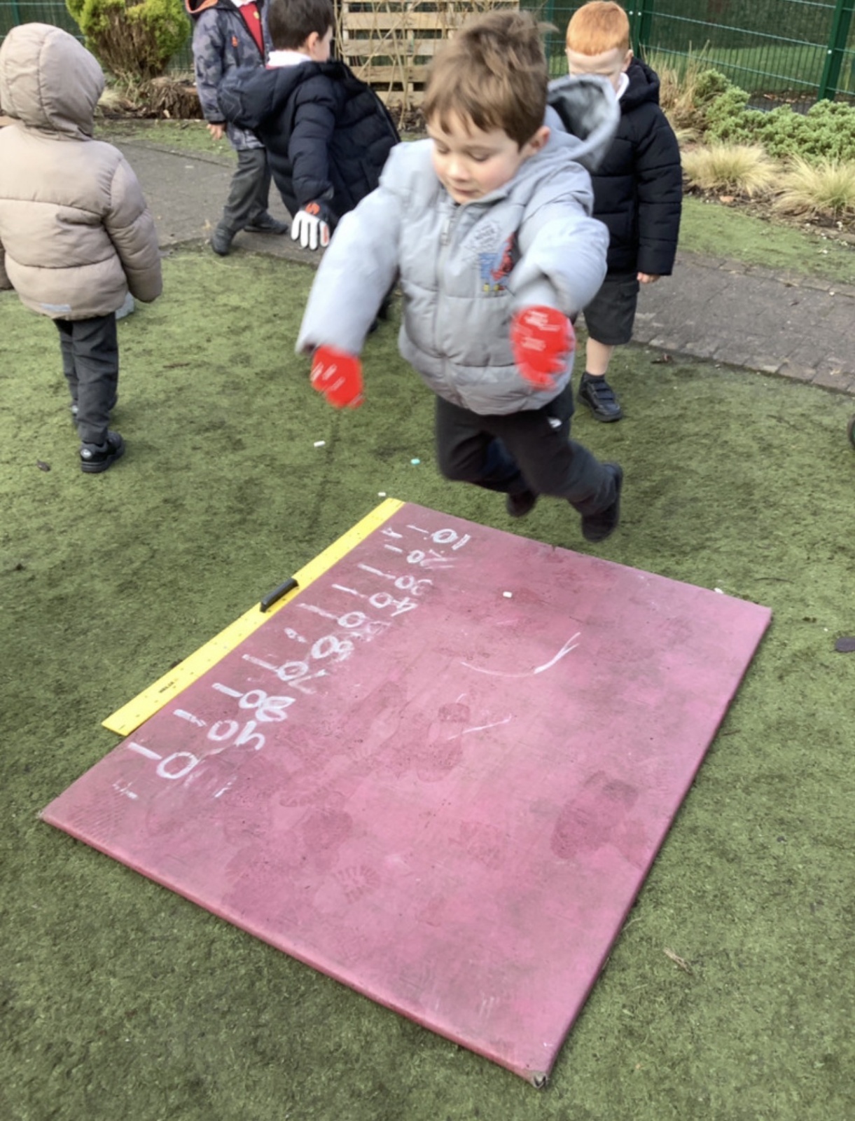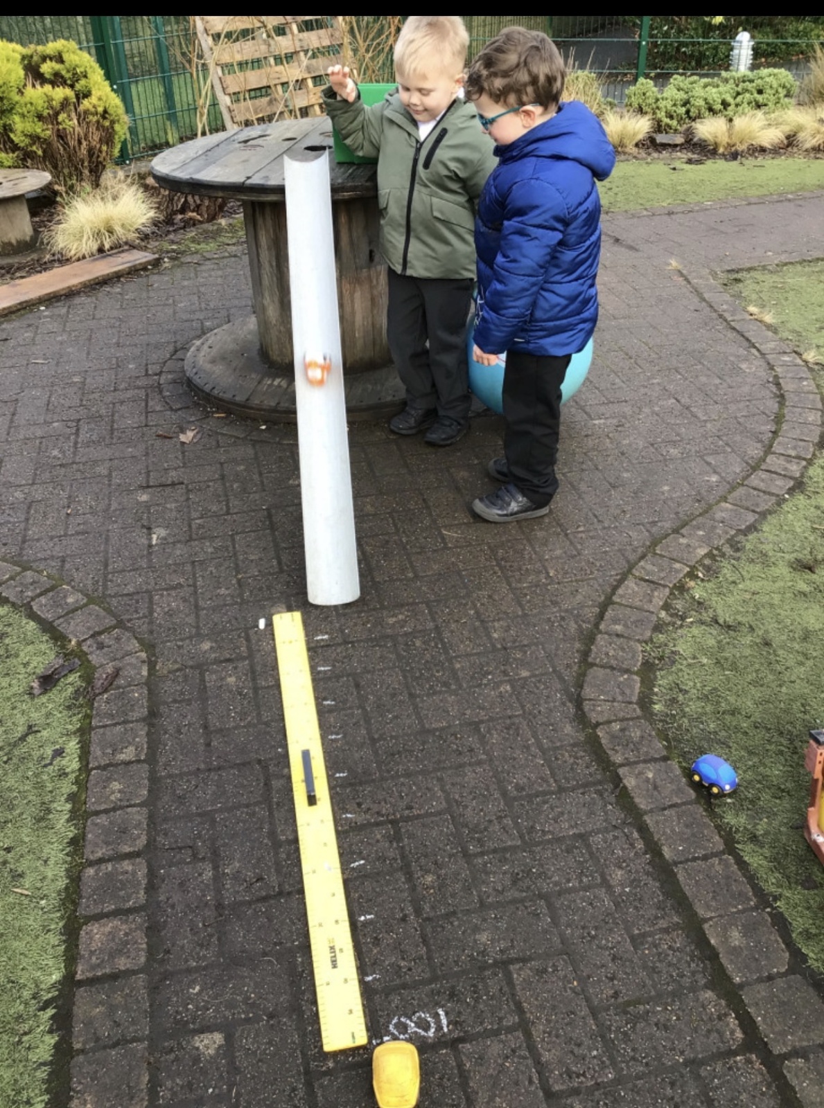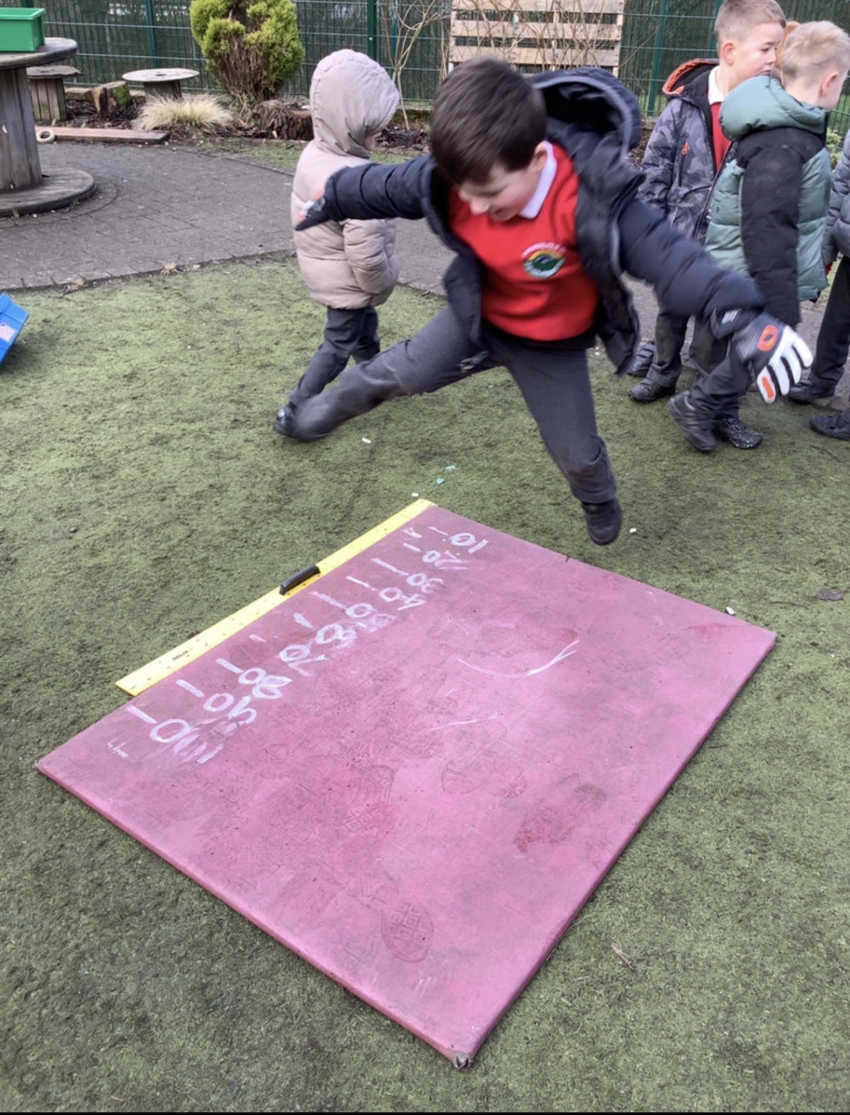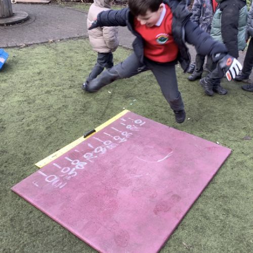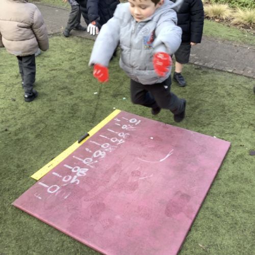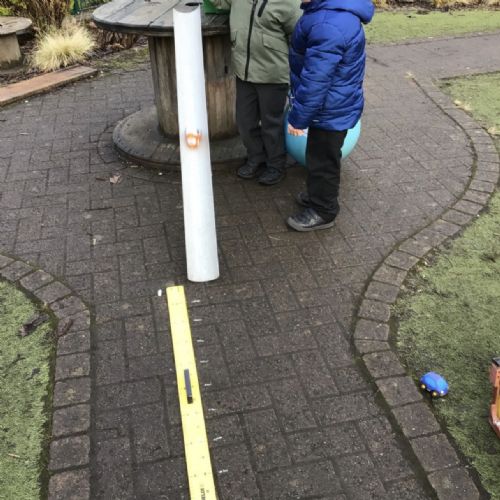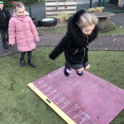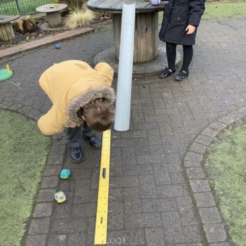 In maths this week our focus has been measure. We have learnt about length, width, height, mass, capacity. We practised our skills in the garden. Measuring our jumps and how far the toy cars would roll. The children discussed whose jump was longer.