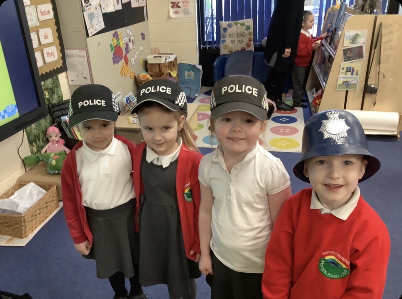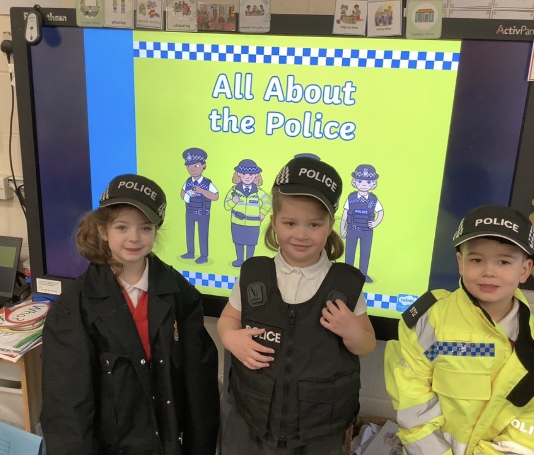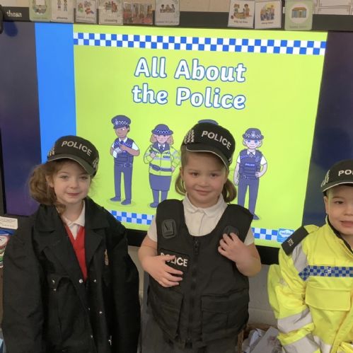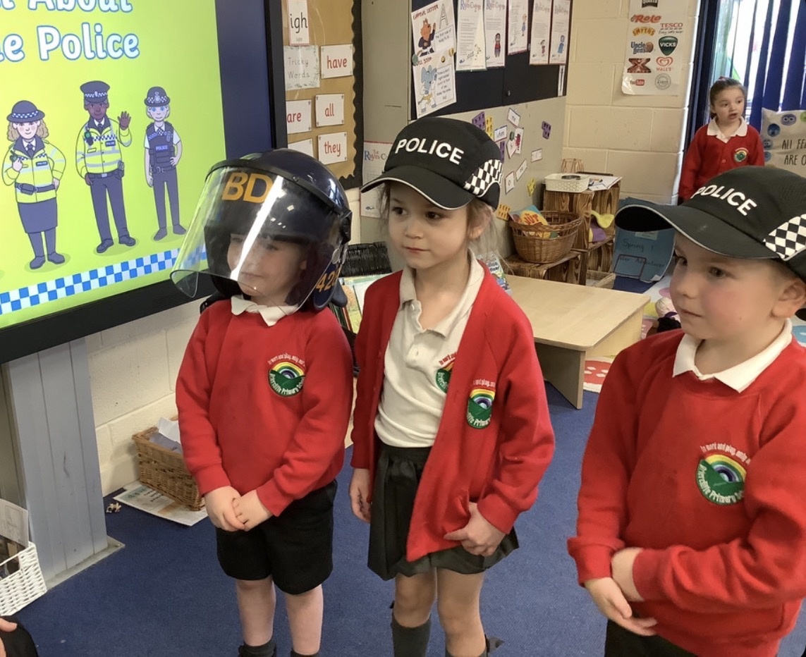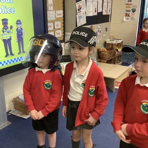 PC Caroline and PC Mark came to visit us. They read us a story to explain their job and how they help people and then we asked them some questions. The best part was when we got to try on the different police uniform.