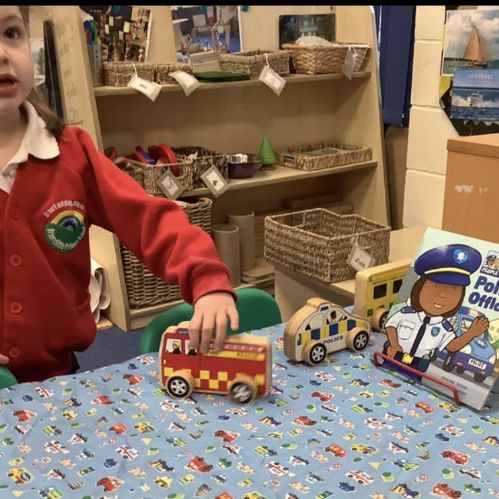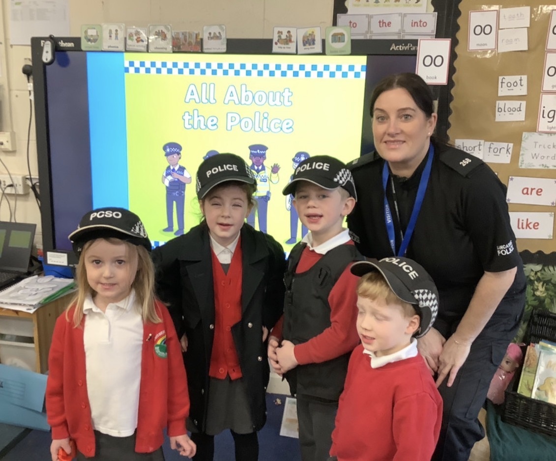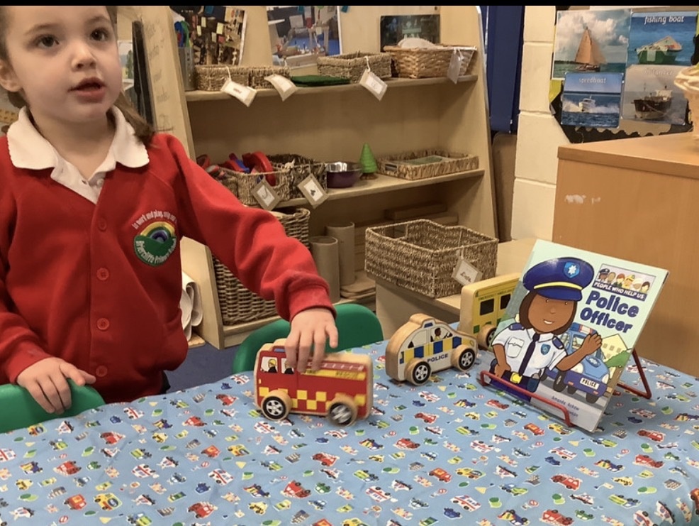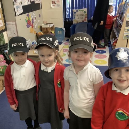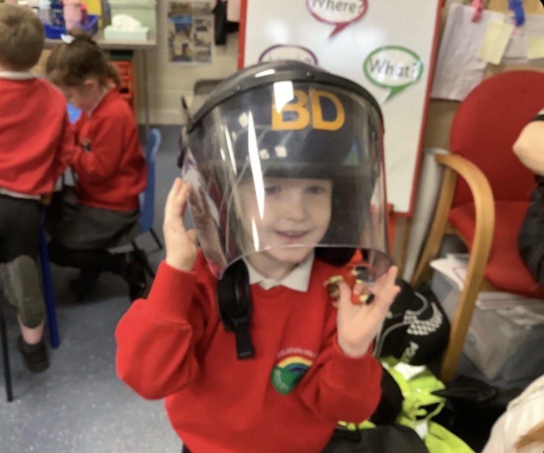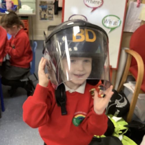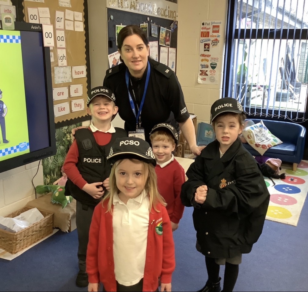 PC Caroline and PC Mark came to visit us. They read us a story to explain their job and how they help people and then we asked them some questions. The best part was when we got to try on the different police uniform.