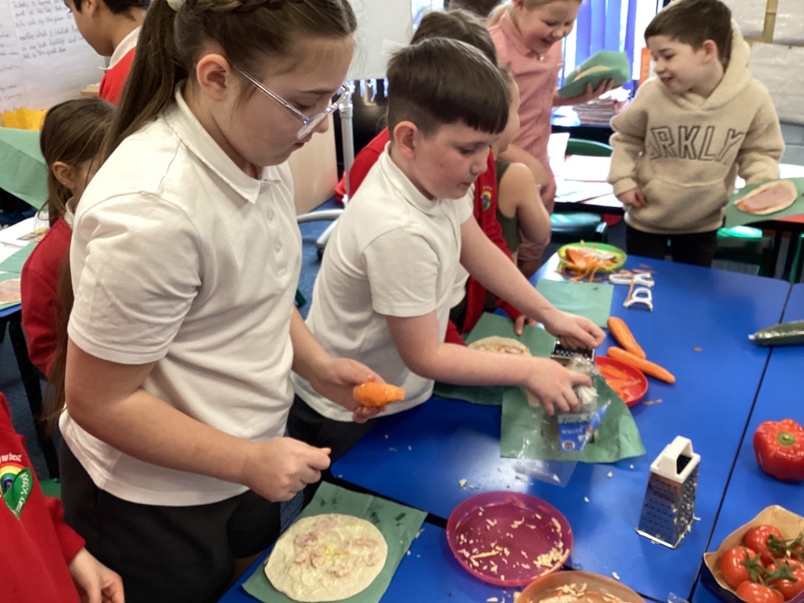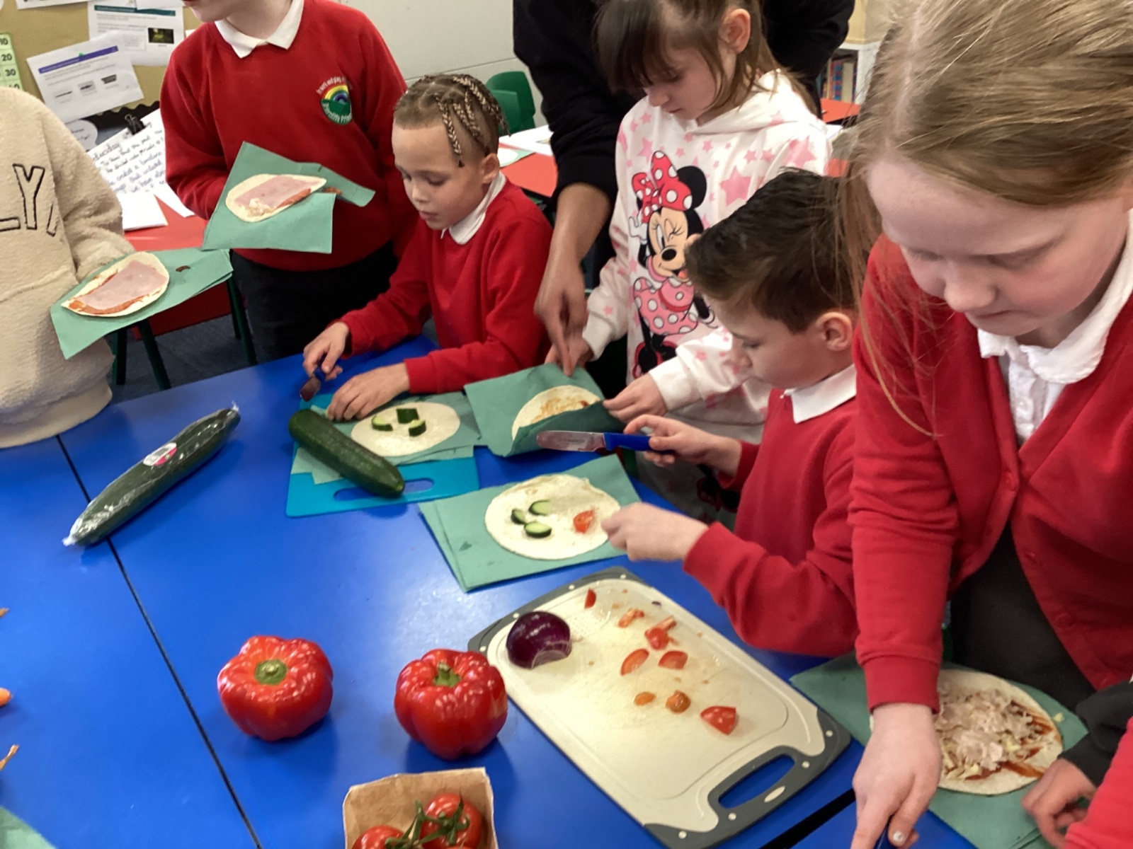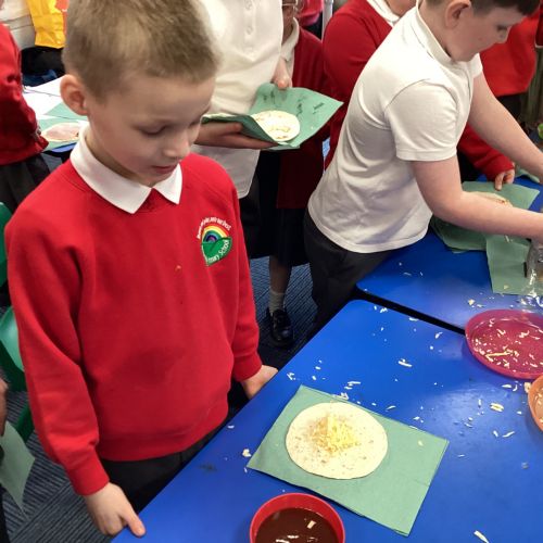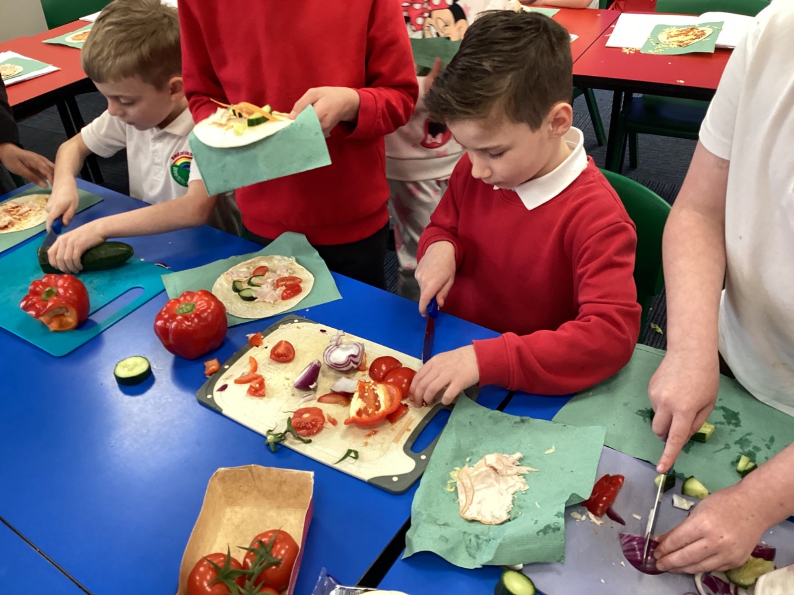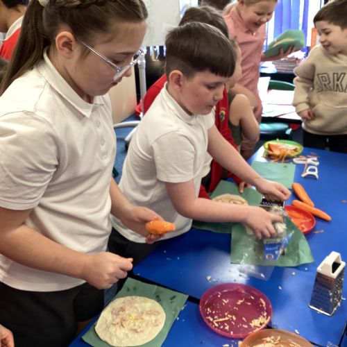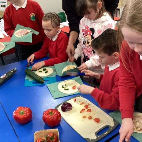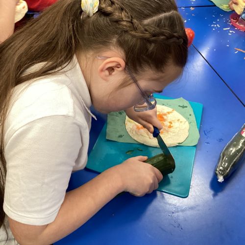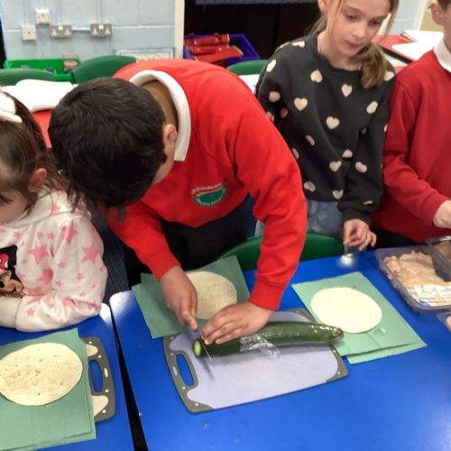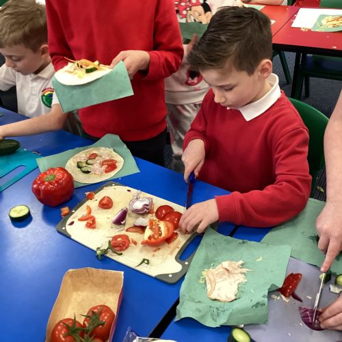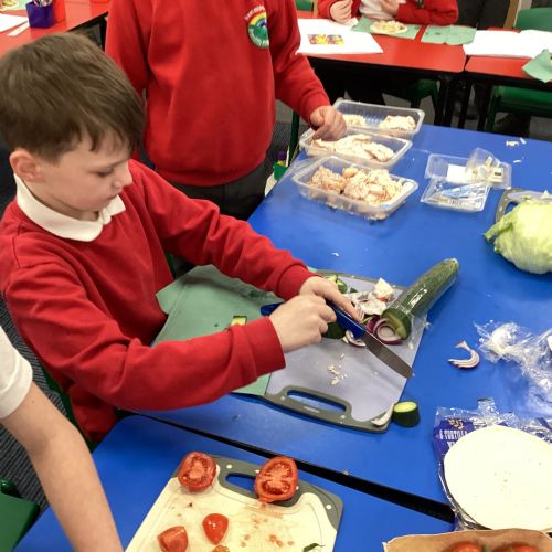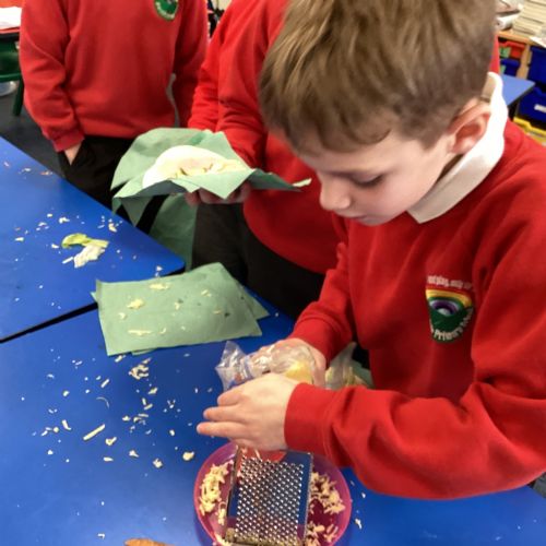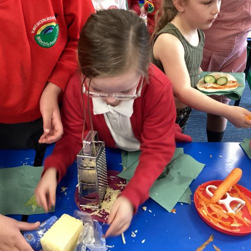 In D.T. the children produced their own booming bread based lunch using a range of healthy foods. They used knives, graters and peelers to prepare their ingredients and then explored the best ways to serve their final product. Michelin star pending...