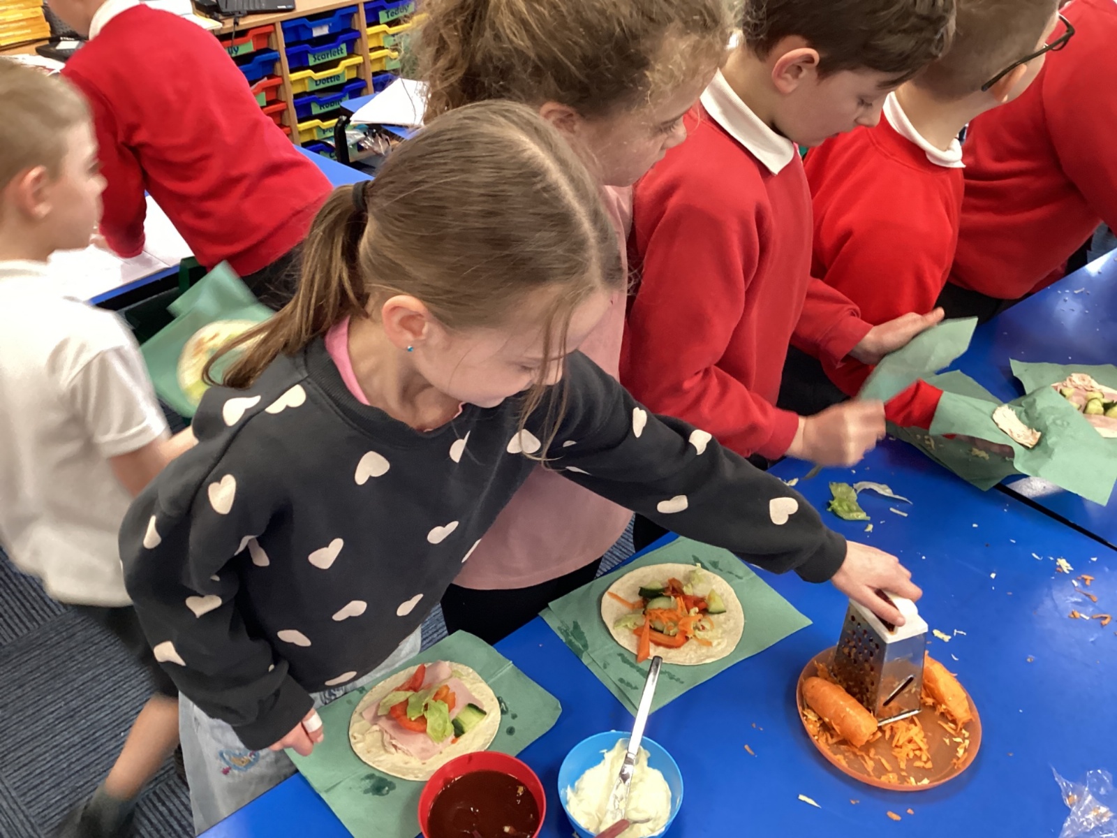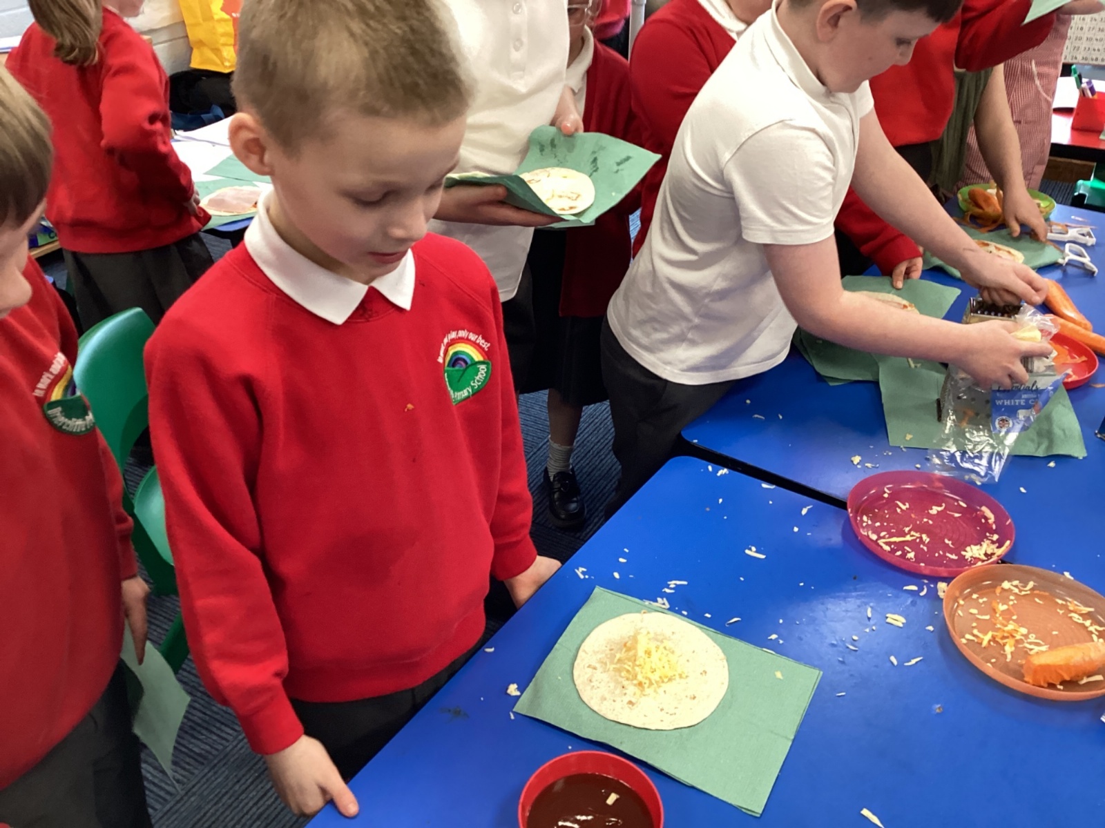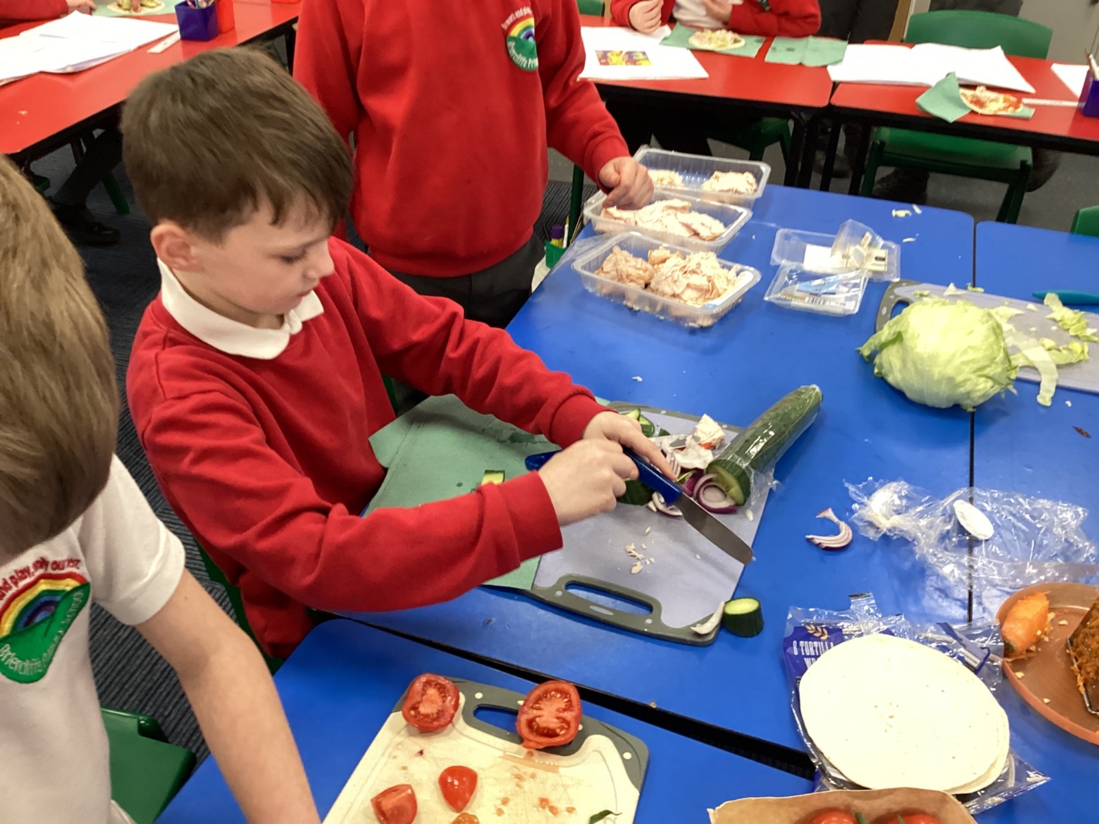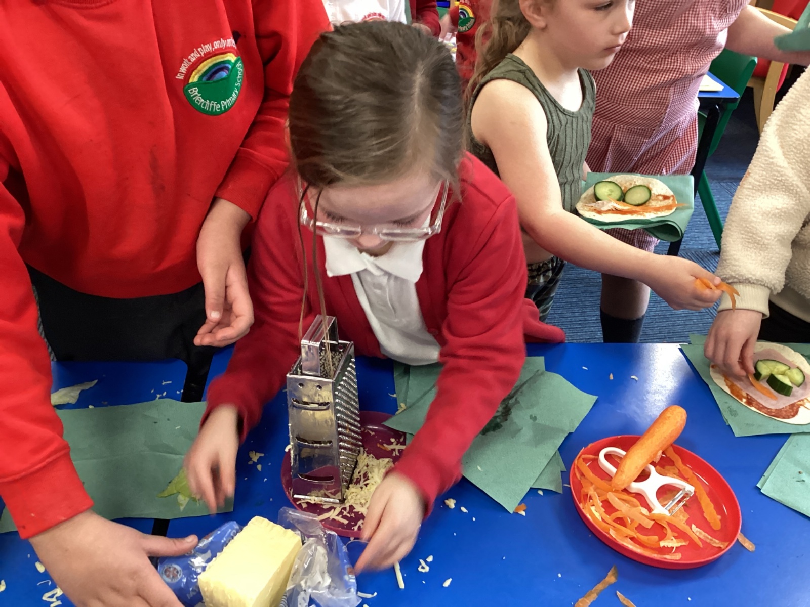 In D.T. the children produced their own booming bread based lunch using a range of healthy foods. They used knives, graters and peelers to prepare their ingredients and then explored the best ways to serve their final product. Michelin star pending...